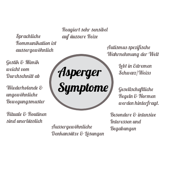 Die Mimik – die Nachahmung – bewirkt auch, dass das Asperger-Syndrom mehrheitlich nicht oder erst sehr spät erkannt wird. Auch sind typische Auffälligkeiten wie fehlender Blickkontakt und das zurückgezogene Verhalten, sozial eher akzeptiert zu werden, schlicht als Schüchternheit ausgelegt. Anzeichen, die auf das Asperger-Syndrom hinweisen können, sind – neben den bereits genannten Symptomen – Schlafprobleme, eine ständige Überreiztheit, Wutanfälle zu Hause, während in der Schule alles funktioniert, sowie emotionaler Rückzug und emotionale Aus- und Zusammenbrüche. Häufig treten die Auffälligkeiten im Zusammenhang mit äußeren Veränderungen wie Umzug, Schulwechsel, Scheidung der Eltern oder der Geburt eines Geschwisterkindes auf. So kann ein Schulwechsel von der Primarschule auf die Oberstufe bei einem zuvor gut integrierten Asperger innerhalb von Wochen zur kompletten Schulverweigerung führen. Denn die neue Situation samt unbekannter Umgebung und gesteigerten Anforderungen kann ein Kind mit Asperger oft nicht mehr selbst kompensieren, was dann zur totalen Überforderung führt.